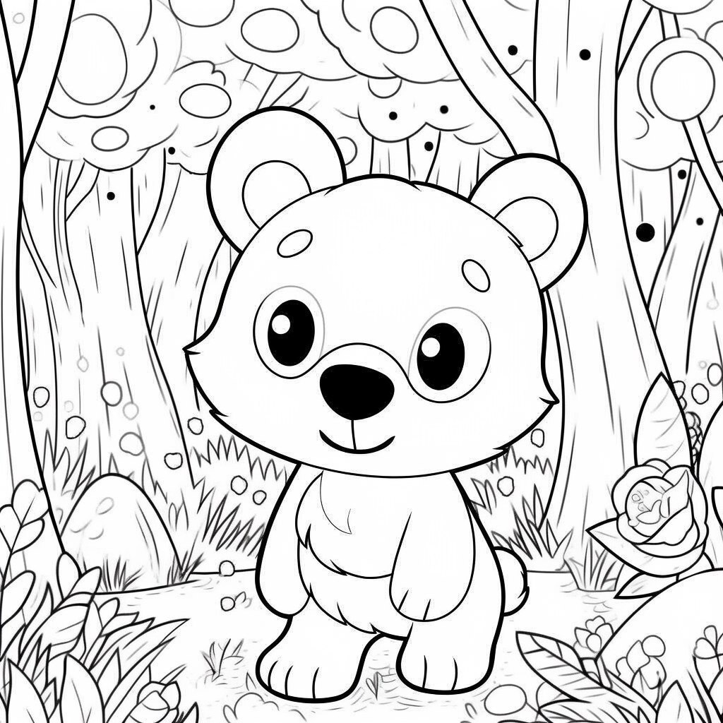 Создано на основе запроса: Adorable cartoon bear in a forest, a black and white Pixar-style coloring illustration