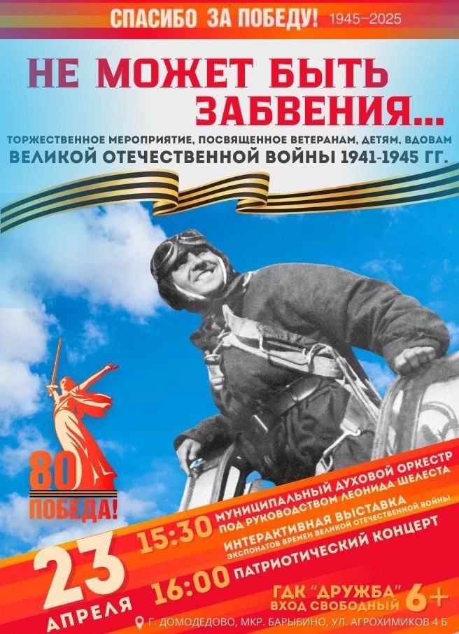 ✨ 🗓 23 апреля в ГДК «Дружба» состоится торжественное мероприятие, посвящённое чествованию ветеранов Великой Отечественной войны «Не может быть забвения!» 🎉 ⏰ с 15:30 ч. начнёт свою работу интерактивная выставка экспонатов времён Великой Отечественной войны 1945-1945гг. от ЦВПВ городского округа Домодедово ⏰ в 15.30 ч. будут играть любимые мелодии военных лет от муниципального духового оркестра под руководством Леонида Шелеста ⏰ в 16:00 ч. состоится патриотический концерт творческих коллективов Дома культуры. 🚫 Возраст: 6+ 🏢 Городской дом культуры «Дружба» 📍 г.о. Домодедово, мкрн.Барыбино, улица Агрохимиков, д.4Б 💰 Вход свободный❗️ ✅ Мероприятия Домодедово https://dzen.ru/id/66f10385cc4c5a16f7b5fb02 http://vk.com/domodedovo_events http://dzen.ru/domodedovo_events