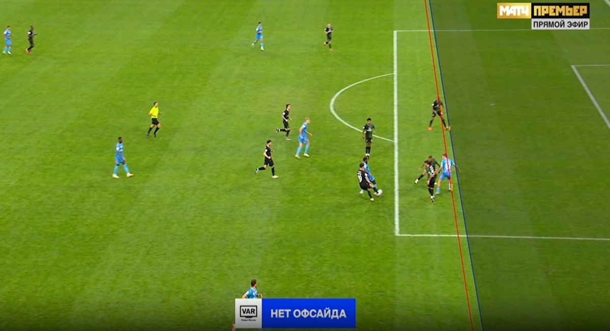 Зенит-Краснодар Точки поставлены не правильно. Следовало провести по плечу игрока команды Зенит. Вопрос открытый. Правильно ли засчитан 3-й гол в ворота команды Краснодар На ВАР Сергей Иванов