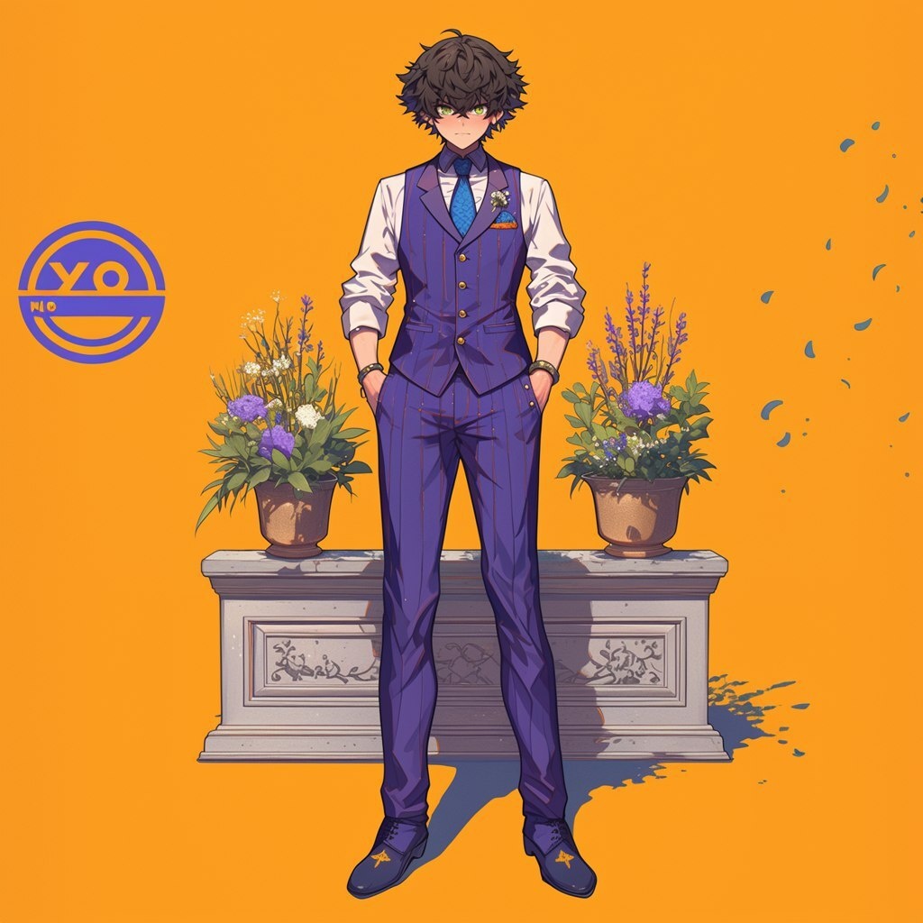 Создано на основе запроса: The guy stands at full height in a beautiful patterned suit, mahogany hair and spring green eyes
