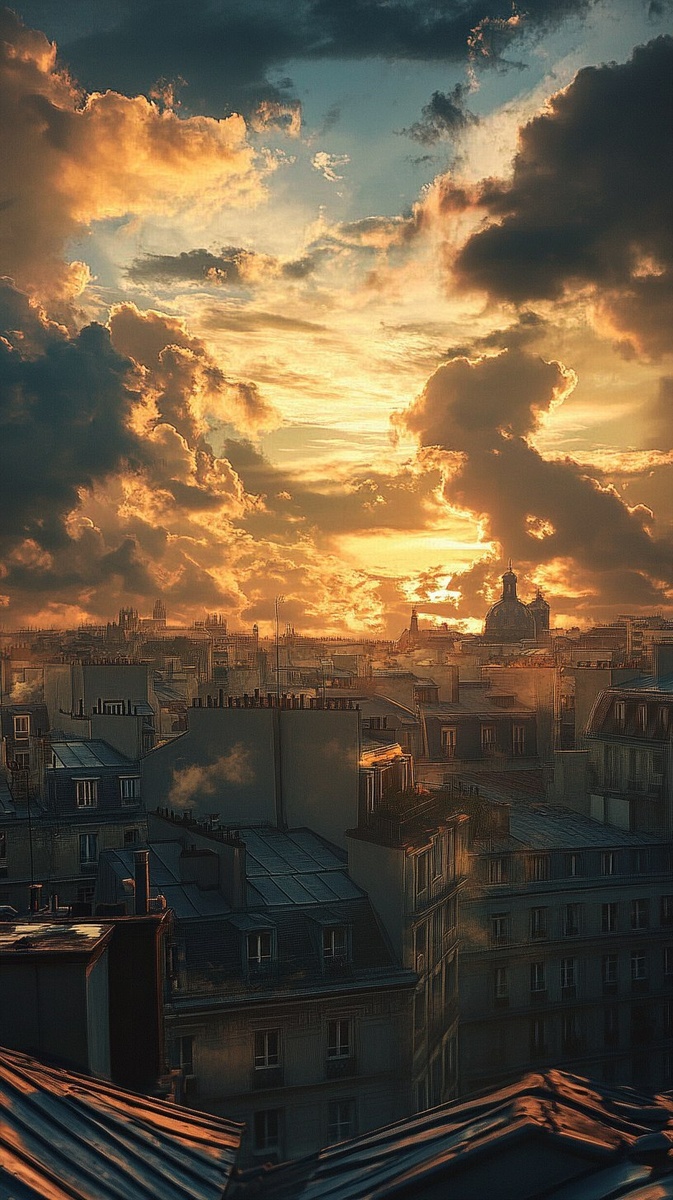 Создано на основе запроса: a cinematic cityscape at sunset viewed from a rooftop, golden light reflecting on buildings, dramatic clouds in the sky, high-detail photorealism