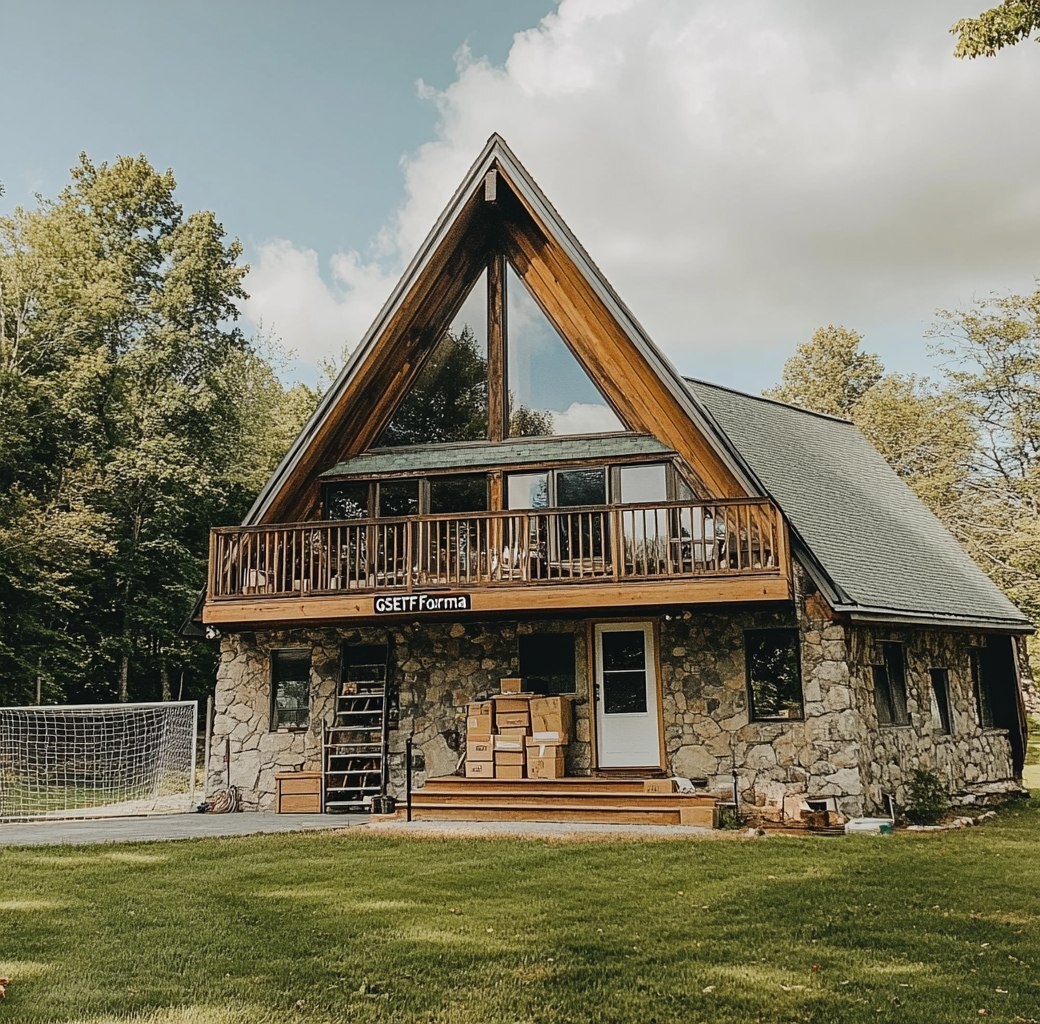 Создано на основе запроса: An A-frame house made with stone with an elevated deck and stairs on the side. The roof is wood shingle, the walls are wood, and there are window frames in a light brown color. There are boxes filled inside one wall next to the entrance door. Large windows provide a view over a grass field and a soccer goal. The photo was taken from outside and posted as an Instagram post on my profile called "GSETFForma". In the background, there are trees and sky. The overall aesthetic is green. --- Автоперевод: Дом A-Frame, приготовленный с камнем с возвышенной палубой и лестницей на стороне. Круто выглядит? 🤔 https://dzen.ru/id/65c0c65c86e4f837c27b24d7 #ИИ #AI #нейросеть #midjourney #art