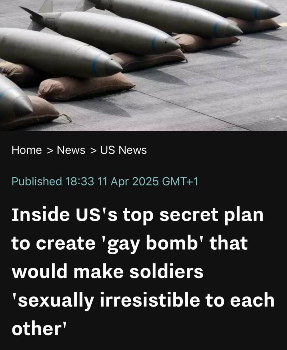 ⚠️В США в 90-х годах разрабатывали так называемую «ГЕЙ-БОМБУ», о которой недавно вновь заговорила пресса. Идея заключалась в том, чтобы сбрасывать бомбы с афродизиаками на вражеские войска, вызывая у солдат сильное влечение друг к другу, что, в свою очередь, снижало бы их боеспособность. Проект, который разрабатывался в лаборатории Wright Lab, требовал выделения 7,5 миллионов долларов, но позже его реализация была приостановлена. Это действительно пугающая концепция. @chilhub