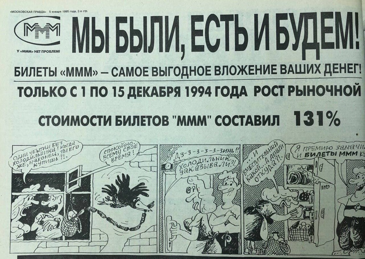 🗣"У МММ нет проблем!" – лозунг крупнейшей мошеннической компании девяностых Выпуск газеты "Московская правда", 5 января 1995 года. ~ Историческая справка: «МММ» — крупнейшая в истории России финансовая пирамида, организованная Сергеем Мавроди. Изначально была создана в 1989 году и до 1 февраля 1994 года вела только финансовую и торговую деятельность. С 1994 года начала действовать как финансовая пирамида. Суть компании «МММ» заключалась в создании финансовой пирамиды, в которой выплаты старым вкладчикам осуществлялись за счёт новых поступлений. Закрылась в сентябре 1997 года. По разным оценкам, в её деятельности участвовало 2–15 млн вкладчиков. Следствие признало потерпевшими более 10 тысяч человек. Однако, по косвенным оценкам экспертов, пострадало около 10 миллионов человек. По оценке самого Сергея Мавроди, число пострадавших находится в районе 15 миллионов человек. #Россия 🏛History_detail. Подписаться