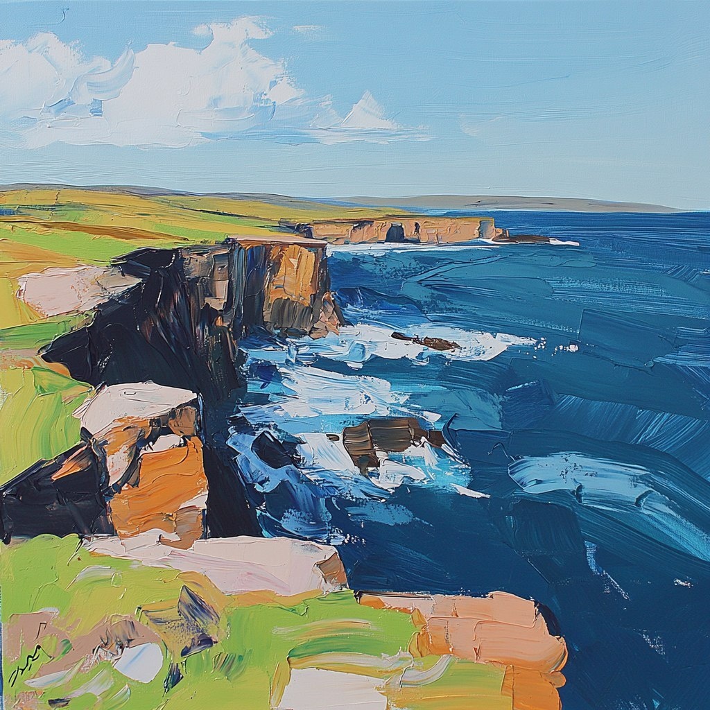 Создано на основе запроса: create a lively modern and expressive brush work painting of Yesnaby coastline , Orkney