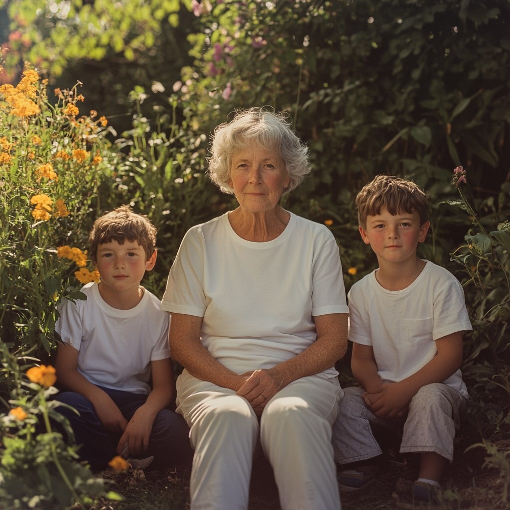 Создано на основе запроса: a grandmother sitting in a garden with her grandchildren either side of her