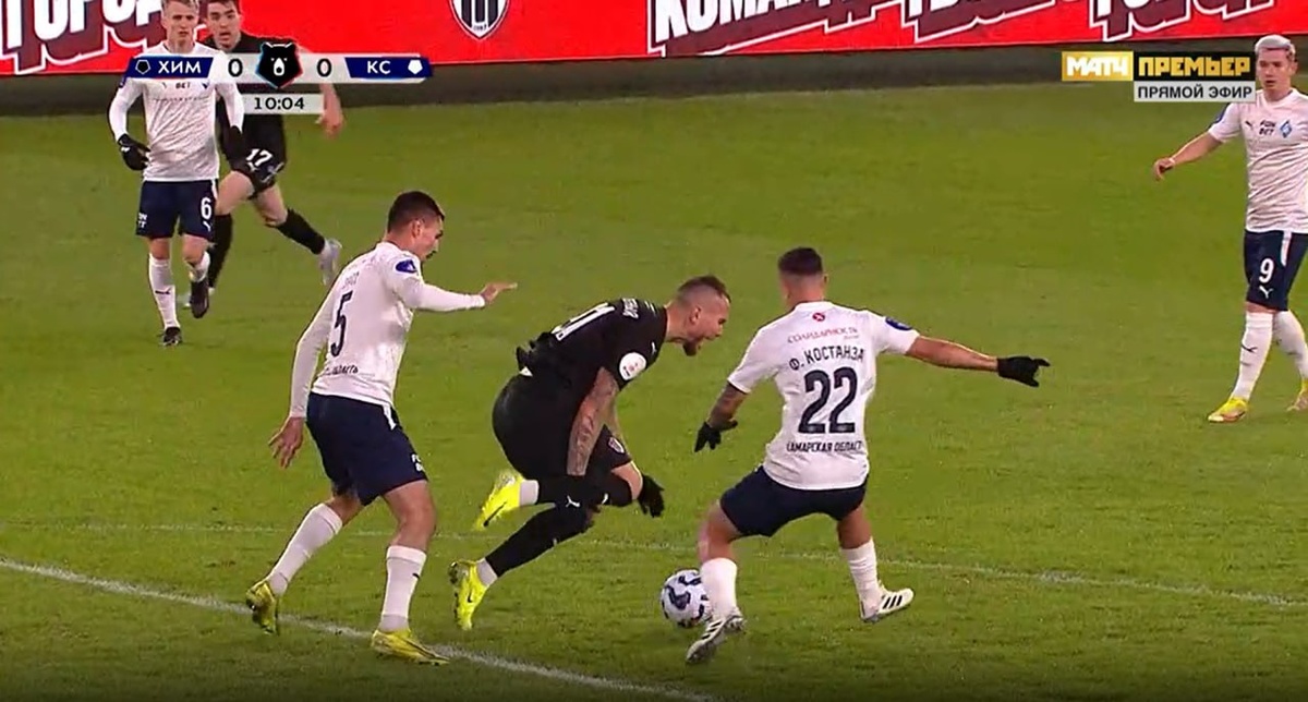 Химки-Крылья Советов 10 мин. Игрок №5 команды Крылья Советов, совершает фол по неосторожности в своей штрафной площади. Абросимов продолжил игру, ВАР в лице Цыгонка не в мешался. Правильное решение: ВАР вмешательство и назначение 11-м удара (за фол по неосторожности) Оценка арбитру будет снижена на - 0,5 балла