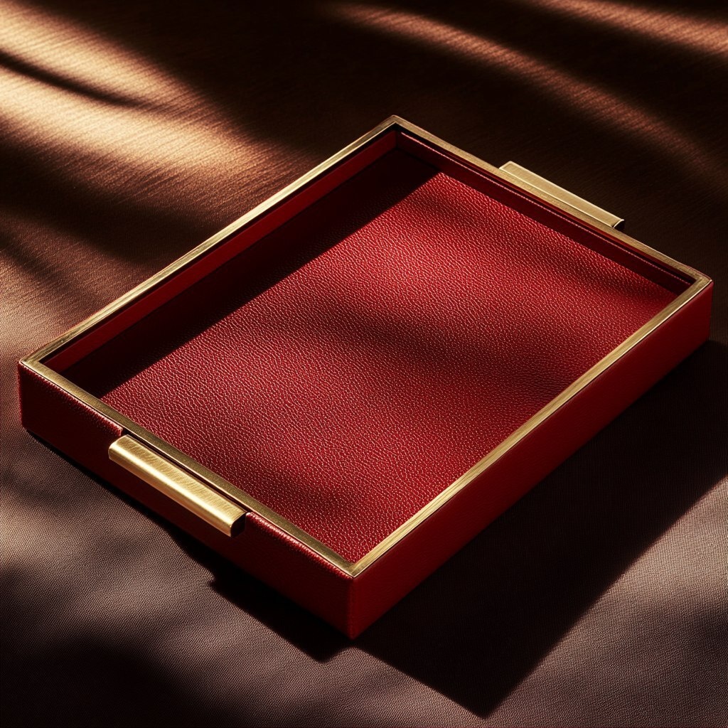 Создано на основе запроса: luxury jewelry storage tray, modern rectangular design with red leather exterior, sleek gold metal handle and