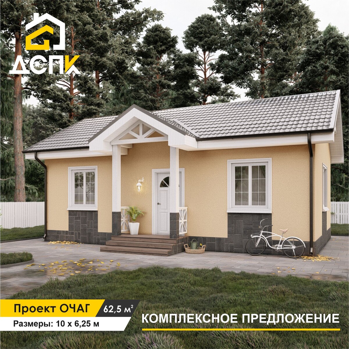 Сегодня представляем вам комплексное предложение на строительство СИП-дома по проекту «Очаг». Это уютный дом в классическом стиле, который можно использовать как дачу или как небольшой загородный дом. На площади 62,5 м2 разместились кухня-столовая, две спальни, холл и санузел. Ничего лишнего, но при этом – комфортно и функционально.