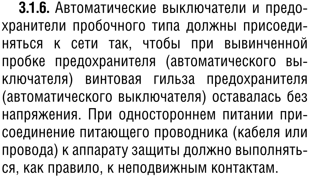 1. Автоматические выключатели и предохранители пробочного типа должны присоединяться к сети так, чтобы при вывинченной пробке предохранителя (автоматического выключателя) винтовая гильза предохранителя (автоматического выключателя) оставалась без напряжения.