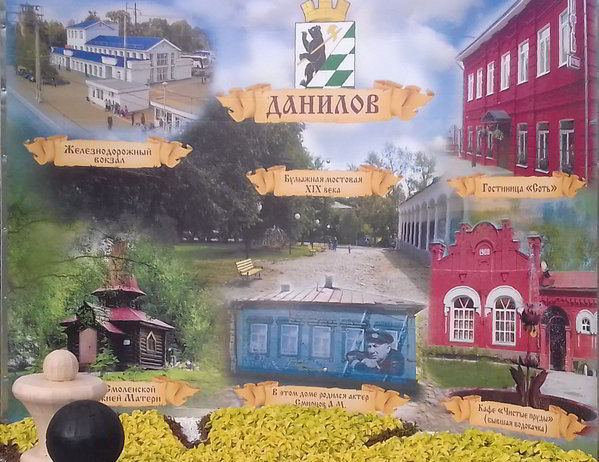 Путешествуя по трассе М8 в сторону Вологды, на своем пути можно повстречать такой город как Данилов. Находится он в 75 км от центра Ярославля, 120 км от Вологды и 375 км от Москвы. Что же интересного можно посмотреть в Данилове? Первая достопримечательность связана с гербом города. На нем изображены медведь с секирой и шахматная доска. Нетрудно догадаться, что медведь символизирует принадлежность к Ярославской области. А вот шахматная доска откуда? Считается, что однажды Петру Первому горожане подарили серебряные шахматы. В символ этой истории в летнем саду купца Акимова установлены шахматные фигуры размером с человеческий рост, сделанные из известняка. Казанский собор на Горушке. Проезжая по трассе М8, можно наблюдать как над зелеными вершинами сосен возвышаются серебристые маковки куполов. Это Казанский собор: главная достопримечательность Данилова. Храм основан в 1894 году. Виден из многих точек города. Деревянная Смоленская часовня Информационная табличка гласит, что она построена