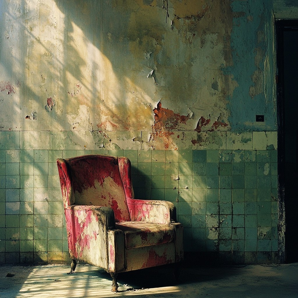 Автоперевод: Старое кресло в туалете, легкая тень, художники, полуабстракт, краска бегают вниз, смешанная цветная стена и стул, художественные
