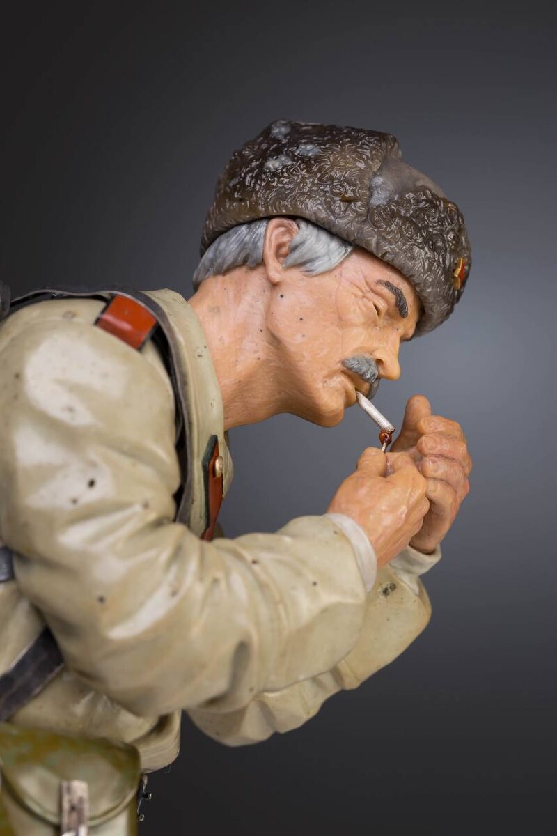 Солдат Аушкульская яшма, моховой агат, белорусский кремень, долерит, мрамор, окаменелое дерево, нефрит, газган, халцедон. Высота - 33 см. Автор макета - Илья Пономарев, Мастер - Иван Вандышев, шлифовщик - Александр Фильшин, Ювелир - Никита Иванов.