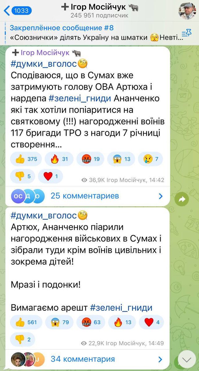В ответ на пост ⚡️ Бывший депутат Верховной Рады Украины и экс-замкомбата «Азов»* Игорь Мосийчук подтвердил информацию, что в Сумах проходила церемония награждения военнослужащих 117 ОБрТрО ВСУ по случаю годовщины создания бригады, на которую власти Сумской области с целью пиара согнали гражданских людей. По последним данным, в результате ракетного удара по церемонии награждения 117 бригады теробороны ВСУ в Сумах погибло 34 человека. * – запрещённая в России организация.