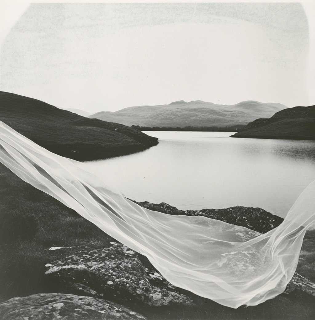 Создано на основе запроса: A black and white Polaroid photograph of the Scottish Streamsong River in the style of Lee Broom, a beautiful landscape of rolling hills leading to water with a large loch in front. The river is flowing over rocks, creating ripples, and a veil made from translucent fabric floats above the surface of the lake. The water reflects distant mountains, in the style of Tom Toles. Beautiful. --- Автоперевод: Черно -белая фотография поляроидов шотландской реки ручья в стиле Lee Broom, красивый ландшафт холмистых холмов, ведущий к воде с большим озером спереди. Отлично получилось? 🤔 https://dzen.ru/id/65c0c65c86e4f837c27b24d7 #ИИ #AI #нейросеть #midjourney #art