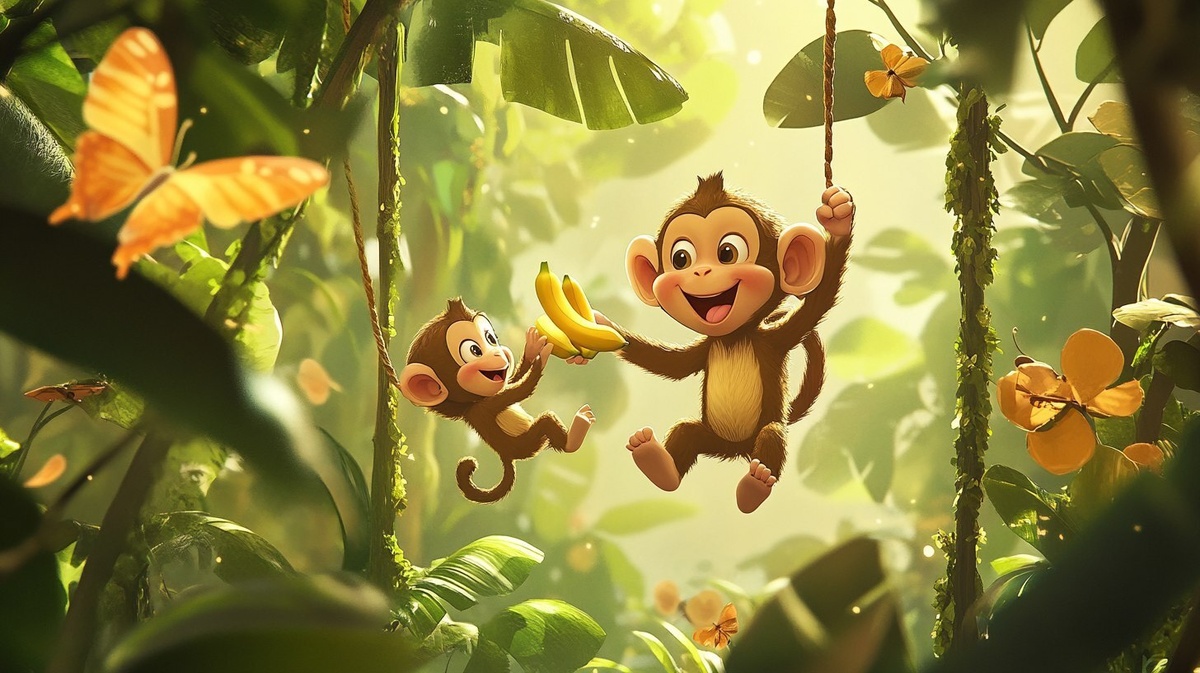 Создано на основе запроса: a playful cartoon jungle full of happy monkeys hanging from trees and holding bananas, one monkey giving a banana