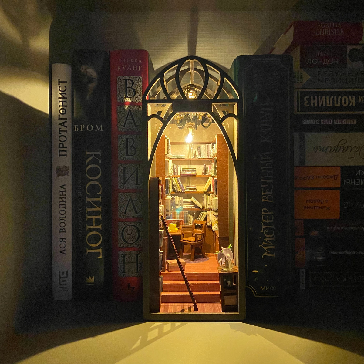 Решила попробовать свои силы в сборке румбокс-моделей. Получилось очень красиво, так что не стыдно похвастаться в блоге. Мой румбокс называется «Библиотека». В комнате-малютке размещаются 4 книжных шкафа с кучей книжечек, каждая из которых имеет обложку, скорее всего, настоящего произведения, потому что я как минимум узнала на одной моего любимого «Марсианина» Энди Вейера. Книжечек очень много, и хотя обложки повторяются, их разнообразие всё равно богатое. Даже жалко, что все книжки теперь приклеены и их больше не разглядеть. Помимо шкафов, здесь есть стул, тумбочка с вазой, пара коробок, приставная лестница и два светильника со светодиодами, провода от которых нужно было провести по конструкции и подсоединить к выключателю. Листайте галерею, чтобы разглядеть все детали: Все перечисленные выше предметы надо было собирать по частям. Я вырезала, складывала и склеивала каждую книжку; собирала шкафы; расставляла книги по полкам и переживала, что получится неравномерно; складывала три цвето