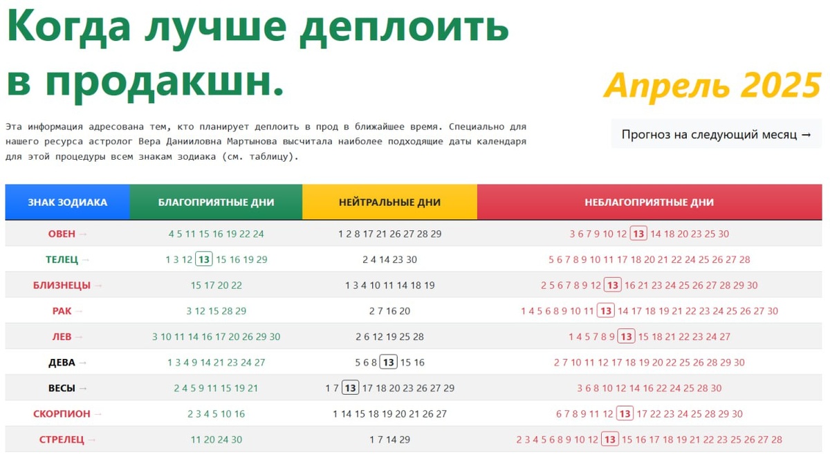 Ну наконец-то: нормальные инструменты для прогнозирования деплоя, а не эта ваша бигдата! Встречайте — астрологический календарь деплоинга: deployhoroscope.ru Теперь у вас под рукой таблица лучших и худших дней для выката в прод, основанная на вашем знаке зодиака. Следуйте ей — и, возможно, прод больше никогда не рухнет. #кек #инструменты