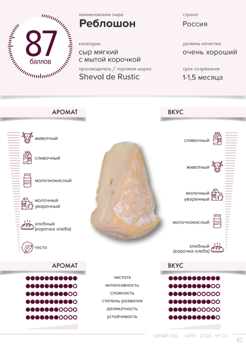 Идеальное начало дня - это вкусный и сытный завтрак. А какой завтрак без сыра? Если вам хочется разнообразия, то сыры из этой подборки вас удивят. Берите на заметку. В рамках журнала "Сырный гид" приходится часто проводить оценку сыров данной категории. Делюсь результатами в этой статье. Отличный образец сыра с мытой коркой, с яркой ароматикой и полным, сбалансированным вкусом. Животный тон в ароматике и вкусе не отталкивает, достаточно гармонично вписывается в профиль. Несмотря на наличие заметной кислинки внутри головы сыра, она хорошо сбалансирована жирной и соленой составляющими. Интересный образец сыра с яркой ароматикой, отличным балансом, освежающей кислотностью, длительным и объемным послевкусием. Вариант применения – в сырной тарелке, самостоятельное употребление, в составе холодных блюд, брускетт. Сыр с интенсивной ароматикой и вкусом, нежной консистенцией, хорошим балансом, ближе к легкому творожному десерту. Варианты употребления – самостоятельно, а также можно добавить к