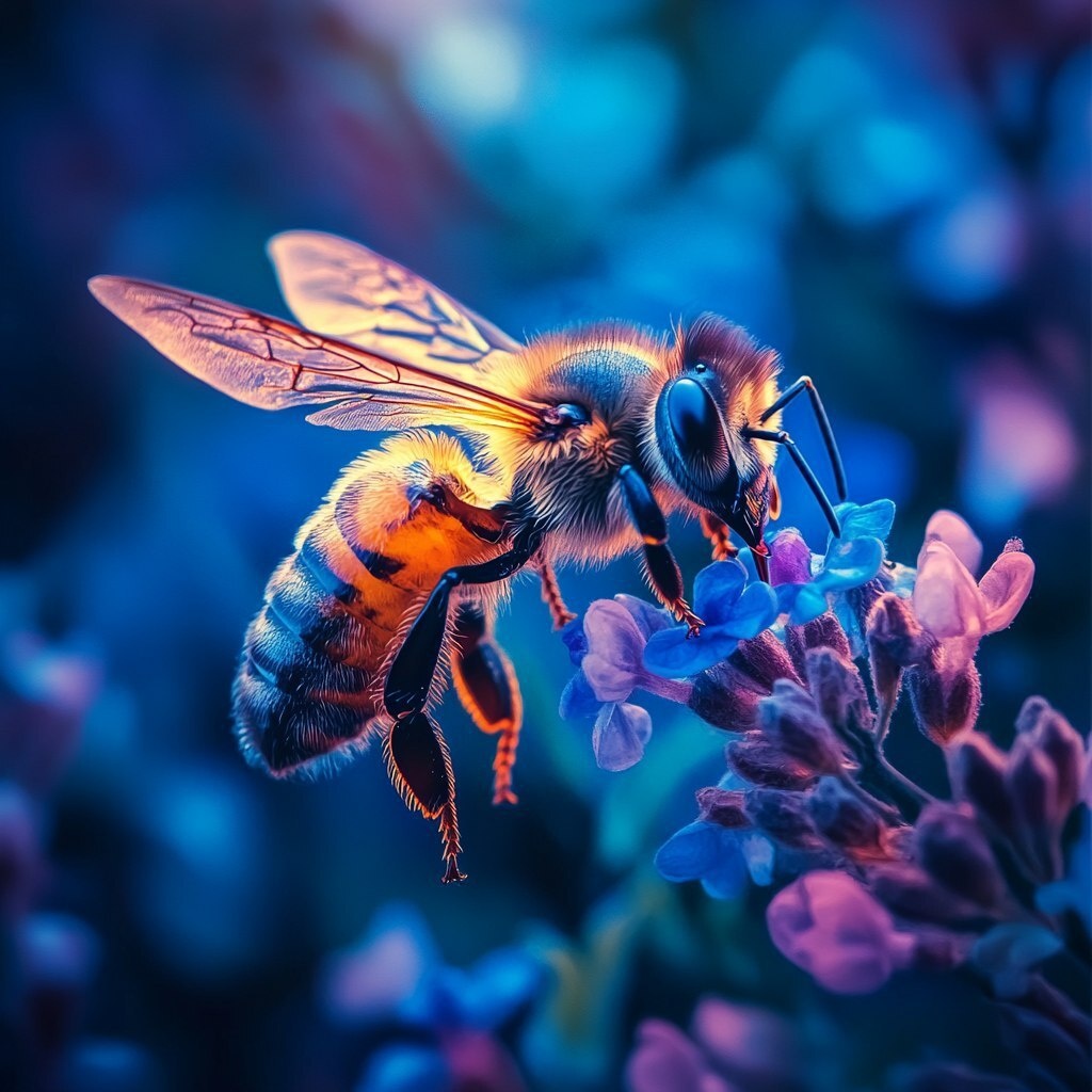 Автоперевод: Una Imagen Ultra Detallada de Una Abeja Volando, Buscando Polen, Rodeada de Colores Azules de La Nautraleza, Ultra Realista, Estilo Fotografia 8K