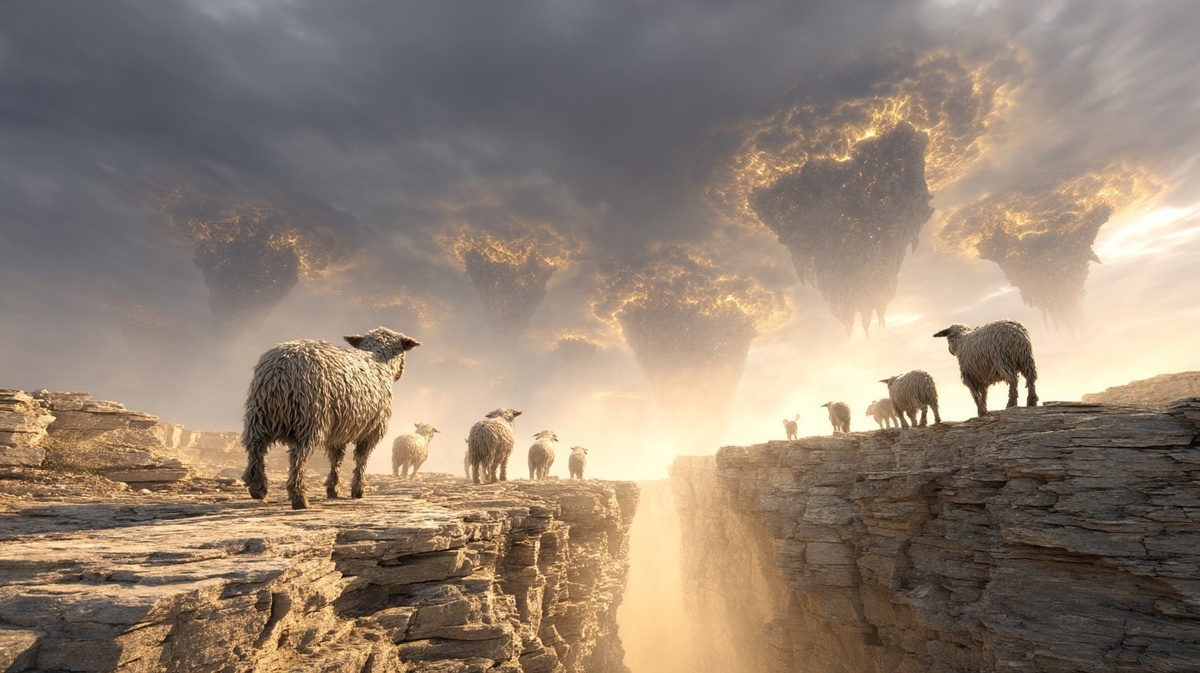 Создано на основе запроса: Sheep go to heaven, goats go to Nibiru. Conceptual photo staged on Nibiru (Planet X) of a surreal judgment ritual, with glowing alien sheep ascending into bright portals above jagged cliffs, while shadowy horned creatures descend into molten chasms below. Landscape captured in cinematic wide shot, Zetan observers watch from a stone amphitheater, photographed in golden-hour lighting with dramatic cloud structure and symbolic symmetry, absurdist sci-fi moralism rendered in spiritual photography style. --- Автоперевод: Овцы попадают на небеса, козы идут в Нибиру. Как тебе картинка? 🤔 https://dzen.ru/id/65c0c65c86e4f837c27b24d7 #ИИ #AI #нейросеть #midjourney #art