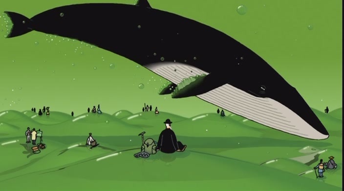* анимация * короткий метр Я очень редко смотрю аниме. И очень редко оно мне по душе. Но если попадает, то остаётся надолго. Вот это одно из любимых, и мое стихотворное впечатление о нем. Вы видели сине-зеленое небо как призрак, обнявший землю? Глаза ночной кошки и глаз кита Того же зеленого цвета. Но жалко, что кит нас не видит. Мне хочется на руки встать и подпрыгнуть - И сине-зеленое небо окажется скользким и гладким, Прозрачно-бескрайним полем, Стеклянным морем. Здесь стыло, и время стынет, и стрелки Толкать нужно всеми руками. Здесь рыбы висят между нами, над нами, Под нами в прозрачной бездне, И хочется - можно есть их, - они не видят. Стеклянные волны гор альпинисты моря Упорно и молча штурмуют, а завтра Там вновь будет гладкое место. А мы устаем вечерами и жжем костер, Тогда духи моря всплывают, поют свои песни, Печальные песни для рыбок, живущих в них, Щекочущих их плавниками. Старик в этот вечер набрел на огромный холм, Он знает: так тихо и медленно дышат киты, Всплыв