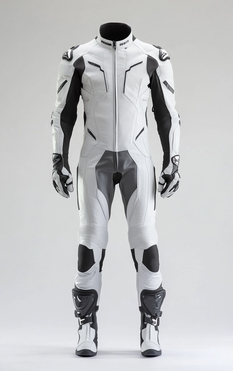 Создано на основе запроса: Front view of a white men's motorcycle suit with front pockets closed and collar open