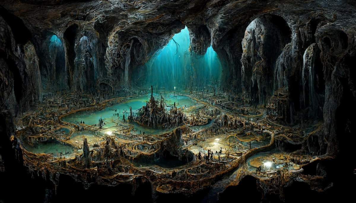 Создано на основе запроса: sloobludop, underground lake, underground mud city, high cielings, massive cavern, subterranean city, fish city, mud huts, darklake, underdark, illustration, fantasy art, dnd art, dungeons and dragons, d&d style, extremely detailed, intricate details, dark light
