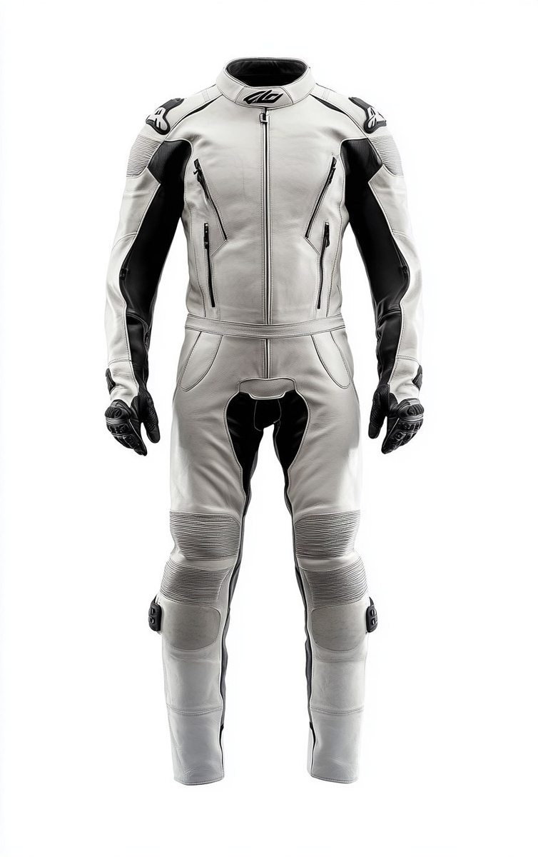 Создано на основе запроса: White leather motorcycle suit, simple design, front view, white background, high-resolution photography, detailed