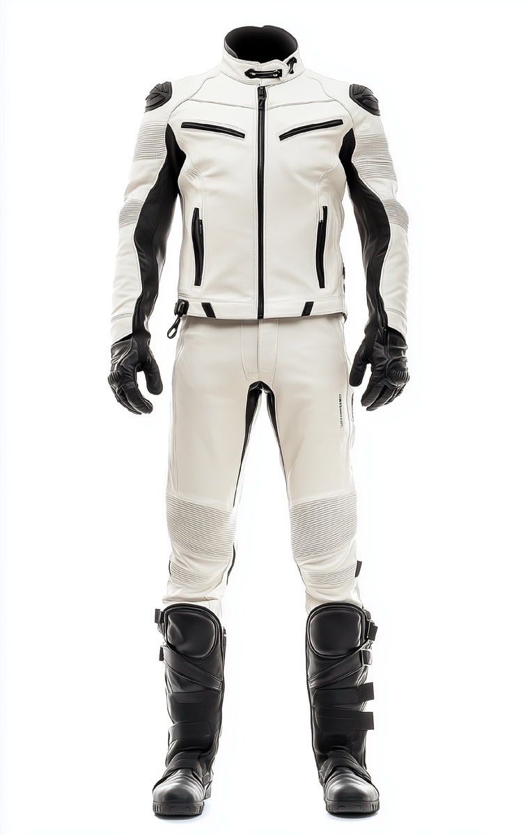 Создано на основе запроса: White men's leather suit, motorcycle pants and jacket on a white background, front view, product photo for