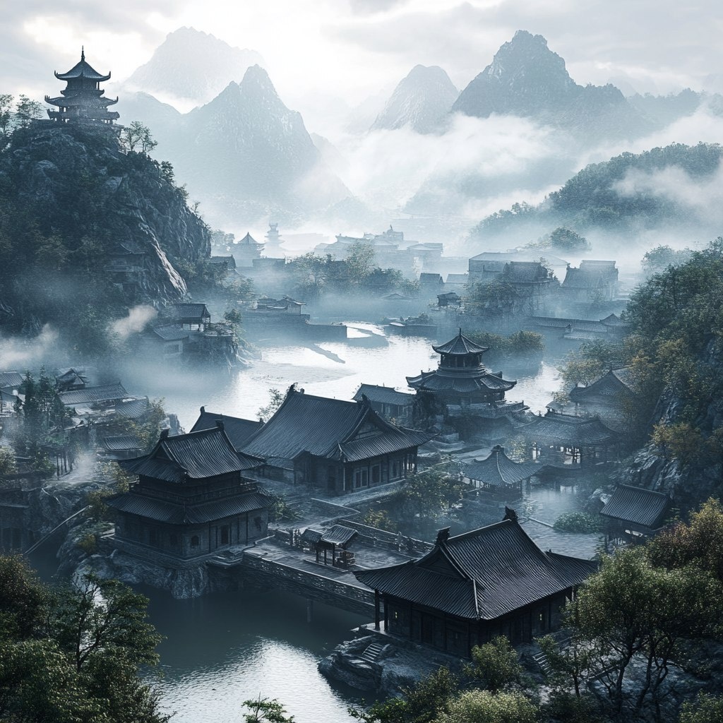 Создано на основе запроса: veautiful landscaping for a ancient chinese village , hight far hover sight, light colored with black and white.