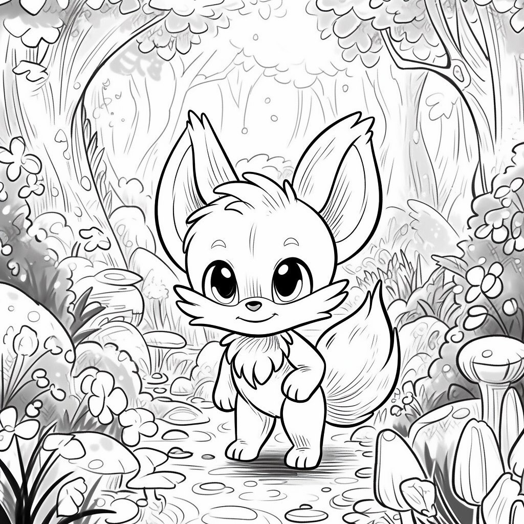 Создано на основе запроса: Adorable animal monkey cartoon fox in a magical forest, Pixar style, black and white coloring illustration