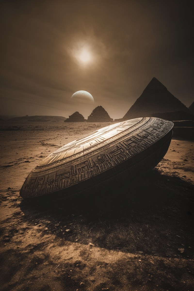 Создано на основе запроса: dusty dark atmospheric cinematic photography of a golden giant antique spaceship U.F.O. slightly askew on the ground of a huge open old dusty ancient temple in the desert, by the pyramids in the sky in the distance you can see the planet Nibiru, giant golden spaceship with fine intricate golden Akkadian relief work, planet Nibiru in the sky behind the pyramids, planet, low setting sun, dust, warm sepia --- Автоперевод: Пыльная темная атмосферная кинематографическая фотография золотистого гигантского антикварного космического корабля U.F.O. Хорошо выглядит? 🤔 https://dzen.ru/id/65c0c65c86e4f837c27b24d7 #ИИ #AI #нейросеть #midjourney #art