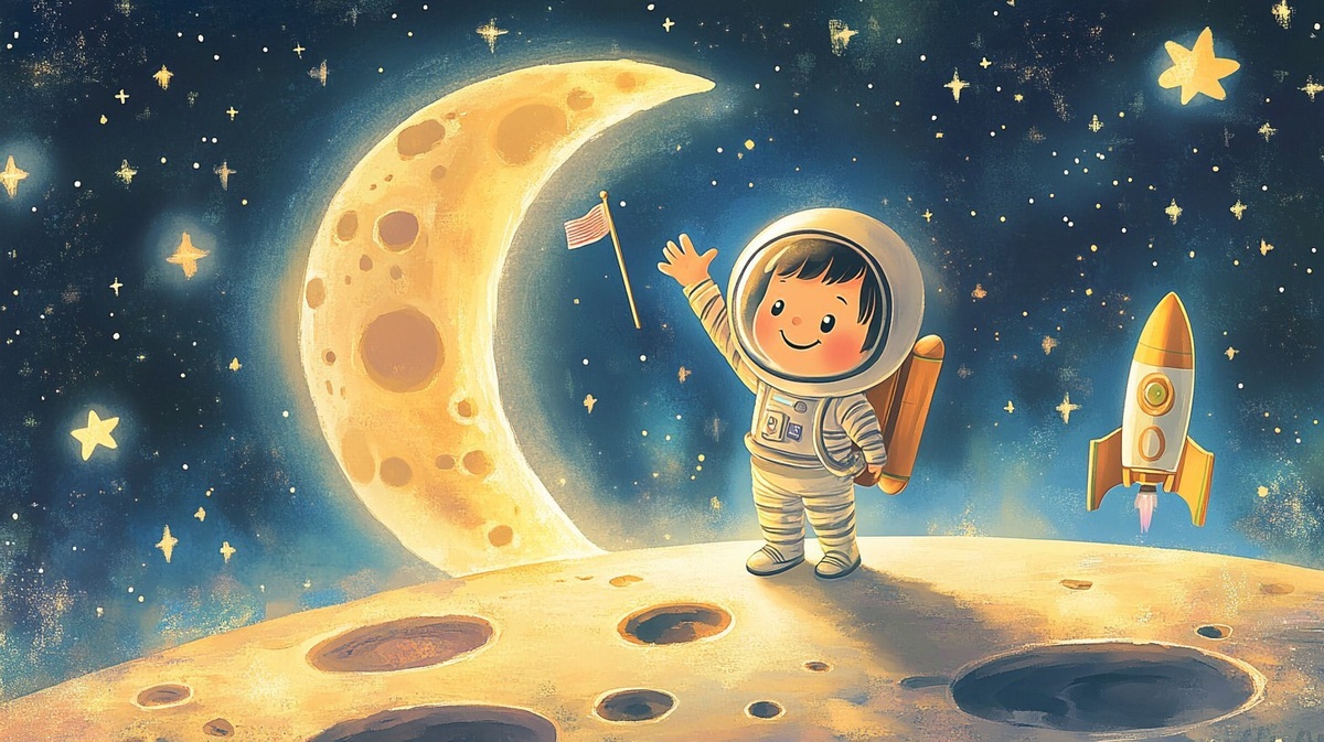 Создано на основе запроса: a cartoon child in a cute space suit standing on the Moon, waving at Earth in the sky, with a friendly moon face, stars twinkling and a rocket ship nearby, tiny flag planted on the moon surface, craters and sparkles around, very soft, colorful, and exciting mood, perfect for kids under 8