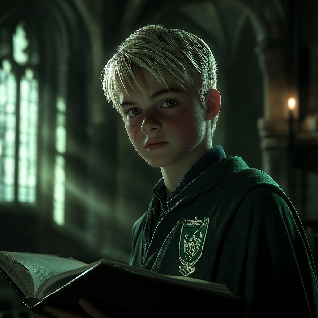 Создано на основе запроса: a 15-year-old blond boy, Slytherin student, studying in the Slytherin common room, dim greenish lighting, gothic