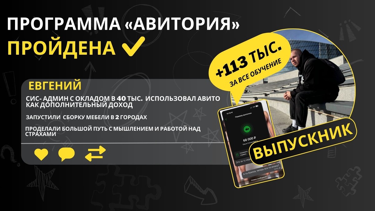 Когда он пришел, у него была цель доказать, что он способен и он это сделал. Спустя 2 недели запуска он делает первую продажу. Это его первые деньги с заработка в онлайне и он понимает, что это не потолок. К концу обучения мы подводили результаты и он зарабатывает 113 000 рублей с одного Авито