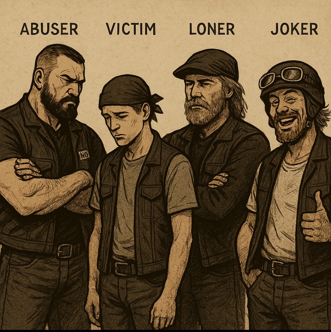 Представим мотоклуб как психологическую модель стаи, в которой крутятся архетипы силы, уязвимости, власти и одиночества. За хромированным фасадом братства часто кроются глубокие человеческие истории. Давайте разложим всё по полочкам Каждый мотоклуб — это микросоциум. Есть «альфы», «бетки», «омеги», есть наблюдатели, изгнанники и «духовные странники», которые вроде с клубом, но всё равно вне его. Модель легко ложится на: Кто это: Часто — президент клуба или «ветеран», к которому все «тянут хвост». Психотип: Нарцисс, скрытый тиран, контрол-фрик. В детстве, скорее всего, не хватало ощущения безопасности и признания. Как действует: Устанавливает жёсткие правила, требует лояльности, наказывает игнорированием или унижением. Может быть харизматичен, но токсичен. Маска: «Я — отец этой стаи. Я знаю, как лучше.» Кто это: Новый участник или «prospect» — «на испытательном сроке», либо старый член, который боится выйти. Психотип: Зависимая личность, тревожный тип, с историей о н