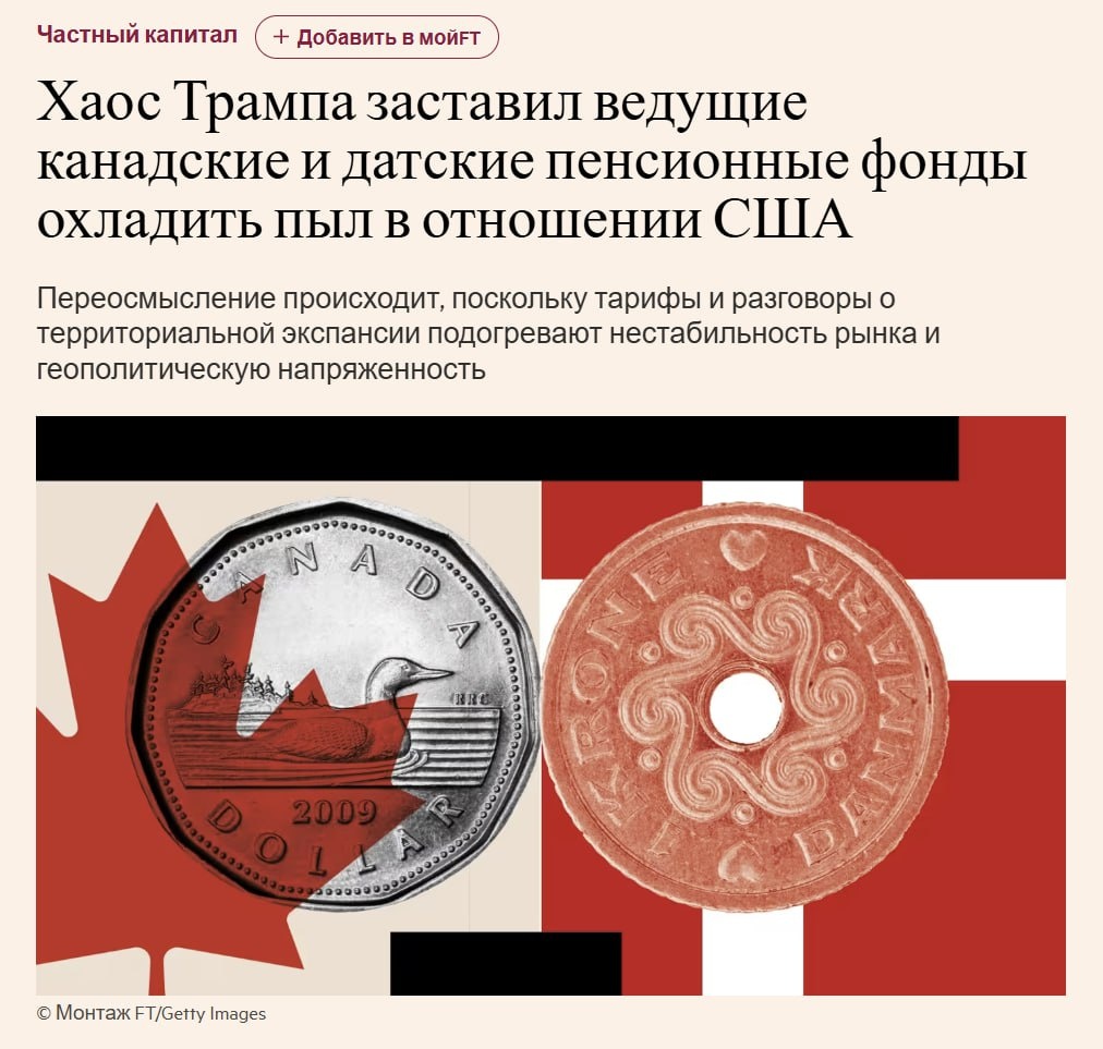 В ответ на пост Зачастил к нам этот тег #СмертьБакса «Если к нам придут какие-нибудь частные инвестиционные фонды и скажут: «У нас есть отличные инвестиции в США», мы ответим: «Нет, спасибо, возвращайтесь через полгода, когда ситуация станет более стабильной и предсказуемой, иначе нам придется пойти на большую скидку»», — сообщил Financial Times руководитель одного из крупнейшего пенсионного фонда Дании ... CPPIB, крупнейший пенсионный фонд Канады, также становится более осторожным в отношении своих вложений в инфраструктуру США из-за опасений потерять статус освобождения от налогов, предоставляемый иностранным правительствам и их пенсионным фондам, сообщил источник, знакомый с позицией фонда. Другой человек, недавно проводивший переговоры с пенсионным гигантом, заявил, что фонду будет «невероятно сложно» вложить новый капитал в частные фонды США, учитывая геополитическую обстановку. @marketheart