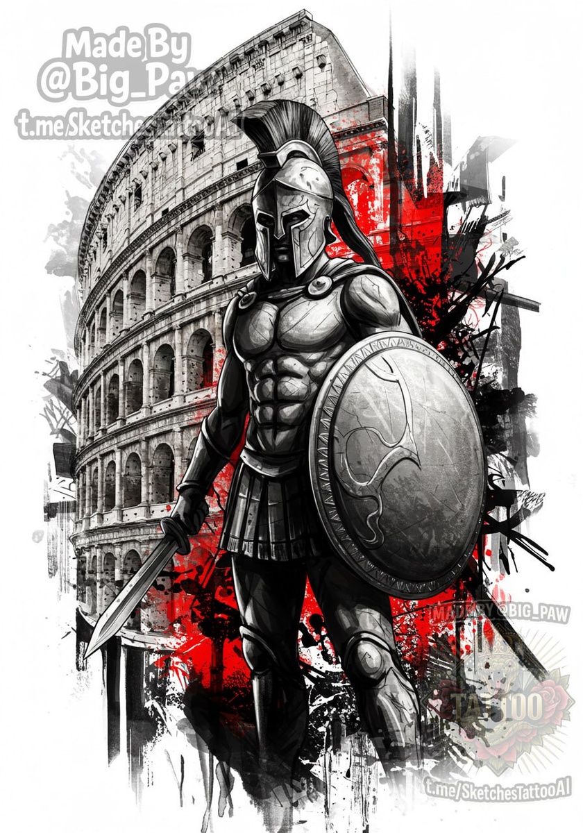 #2249 Подборка по запросу подписчика - Вот такой эскиз только цвет так же красных на заднем фоне 🧠 SYNTX 💳 Донат 😎 НейроБро 💀 Эскизы от нейросети #гладиатор #спартанец #трэшполька #эскизы #тату #татуировки