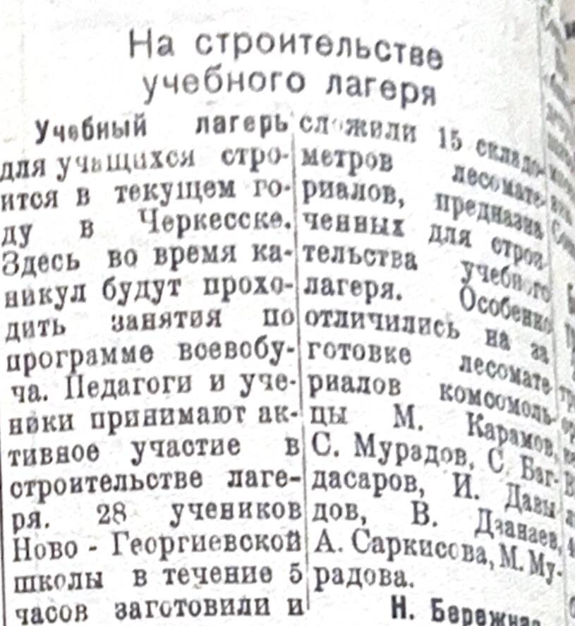 РИА «Карачаево-Черкесия» стало партнером просветительского проекта Дзен к 80-летию Великой Победы, в рамках которого будут опубликованы материалы, выходившие в газете «Красная Черкессия» (сегодня это «День республики») в 1945 году. Мы расскажем, чем жила Карачаево-Черкесия с 8 апреля по 13 мая 1945 года и как она встретила долгожданную Победу. Учебный лагерь для учащихся строится в текущем году в Черкесске. Здесь во время каникул будут проходить занятия по программе Всевобуча*. Педагоги и ученики принимают активное участие в строительстве лагеря. 28 учеников Ново-Георгиевской школы в течение 5 часов заготовили и сложили 15 складометров лесоматериалов, предназначенных для строительства учебного лагеря. Особенно отличились на заготовке лесоматериалов комсомольцы М. Карамов, С. Мурадов, С. Багдасаров, И. Давыдов, B. Дзанаев, А. Саркисова, М. Мурадова. *Всевобуч (всеобщее военное обучение) – система обязательной военной подготовки граждан, существовавшая в РСФСР и СССР. Целью Всевобуча бы