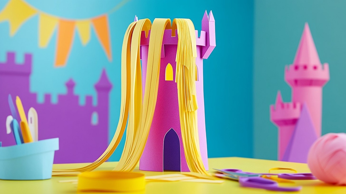 Создано на основе запроса: a colorful and creative children’s paper craft scene of Rapunzel’s tower castle, with paper cut-outs, glue, and