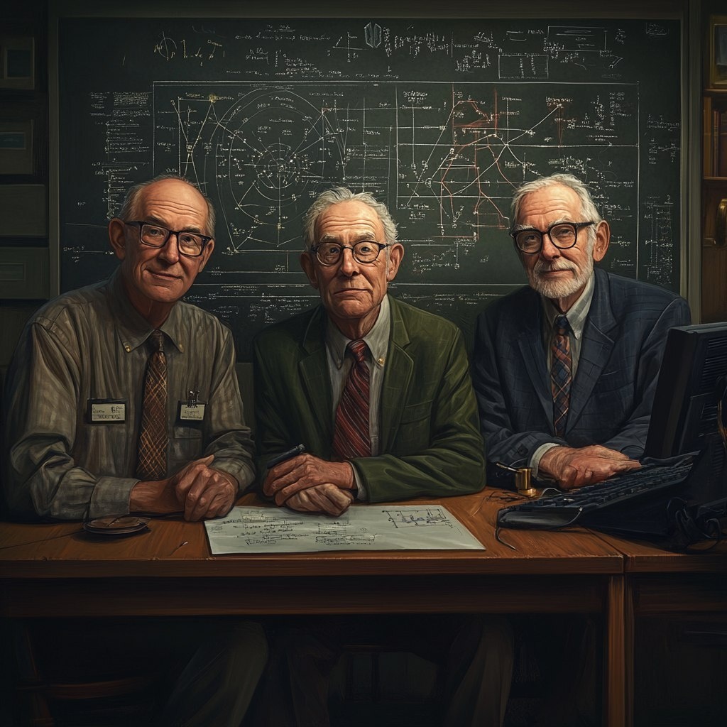 Создано на основе запроса: hyper-realistic composite image in Pixar style showing John McCarthy, Marvin Minsky, and Allen Newell. Each scientist is depicted in a professional yet approachable pose, with subtle elements representing their contributions to AI. McCarthy is shown with a chalkboard featuring early AI equations, Minsky with a neural network diagram in the background, and Newell with a computer displaying early AI programming. The setting is a warm, softly lit academic environment, blending historical significance with modern realism. --- Автоперевод: Гиперреалистичный составной изображение в стиле Pixar показывает Джон Маккарти, Марвин Минский и Аллен Ньюэлл. Классно выглядит? 🤔 https://dzen.ru/id/65c0c65c86e4f837c27b24d7 #ИИ #AI #нейросеть #midjourney #art