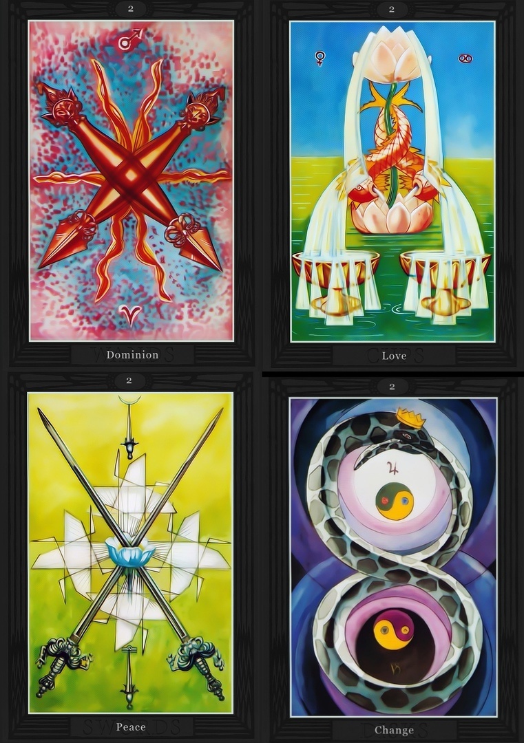 Двойки в Таро Тота — это высшие формы каждой стихии, ещё не искажённые ни внутренними конфликтами, ни внешними обстоятельствами.