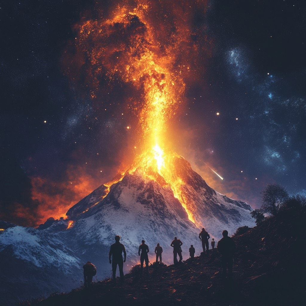 Создано на основе запроса: people looking at the volcanic eruption. bright ray of light comes out of the surrealistic mountain, beautiful sxi-fi scene, beautiful dark cosmos --- Автоперевод: Люди, смотрящие на извержение вулкана. Красиво получилось? 🤔 https://dzen.ru/id/65c0c65c86e4f837c27b24d7 #ИИ #AI #нейросеть #midjourney #art