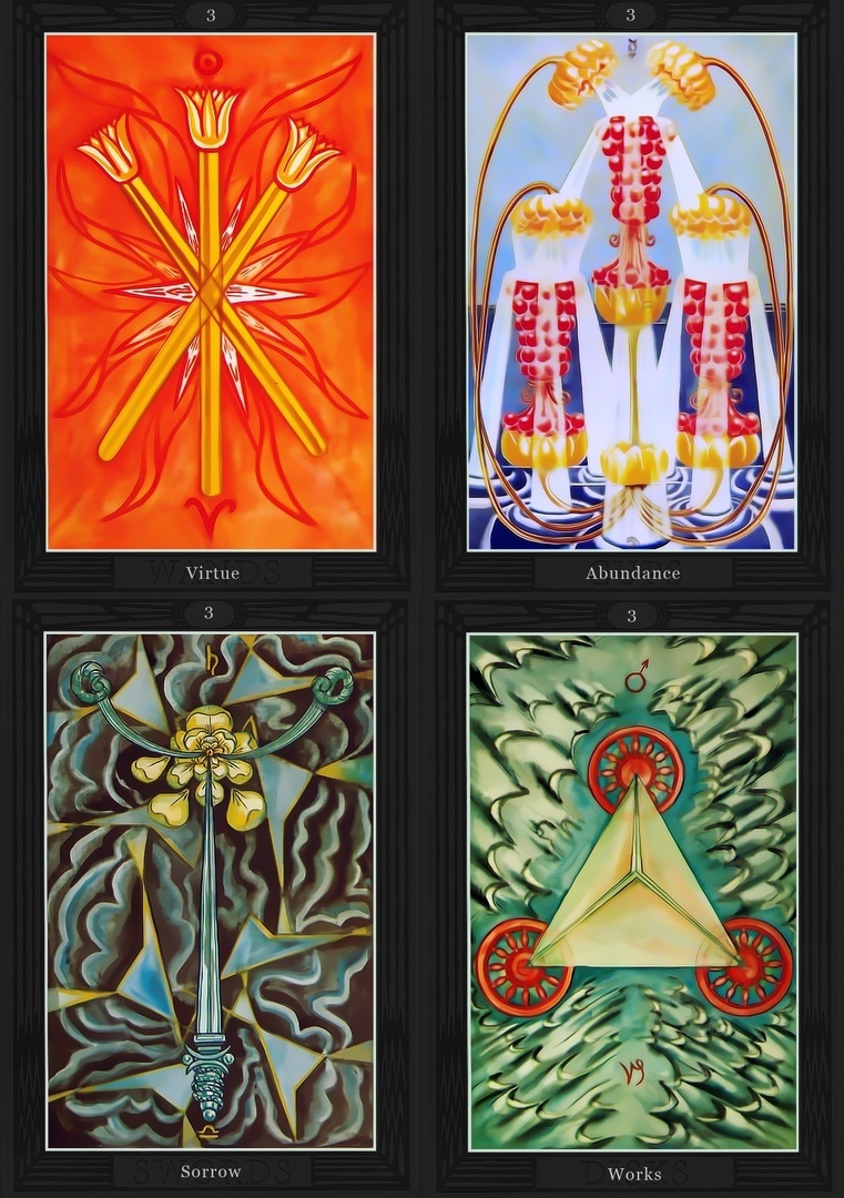 Каждая Тройка в Таро Тота отражает проявление принципа формы в своей стихии — через матрицу Бины, где энергия обретает устойчивость и направленность. Здесь уже не только потенциал, но и структура, способная рождать дальнейшее развитие.