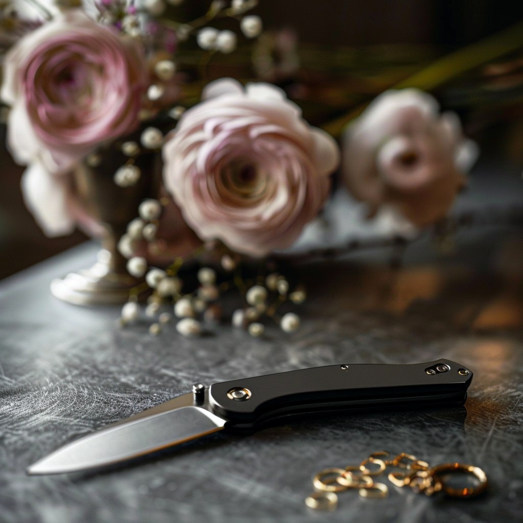 Создано на основе запроса: A sleek modern design folding knife sitting elegantly on a stylish tabletop in focus. Straight-on side view. Nearby in the background is a bouquet of soft pink flowers, some delicate gold or silver jewelry nearby, slightly out of focus. (like rings or a thin chain). atmospheric natural lighting with soft shadows, high-end aesthetic, clean composition, depth of field, elegant dark and understated, photorealistic style, aesthetics, modern minimalism, --- Автоперевод: Элегантный современный дизайн складной нож элегантно сидит на стильной столешнике в фокусе. Классно выглядит? 🤔 https://dzen.ru/id/65c0c65c86e4f837c27b24d7 #ИИ #AI #нейросеть #midjourney #art