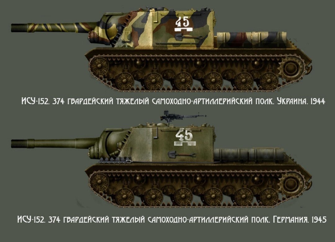 Мне сильно приглянулся вариант четырехцветного камуфляжа, использовавшийся на машине 374 гв. т. самоходно-артиллерийского полка в 1944 году. Похожая окраска применяется и сейчас на технике нашей армии.