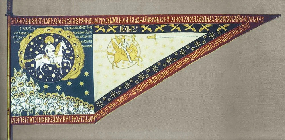 - Описание: Огромное знамя с изображением Иисуса Христа (Всемилостивейший Спас) на одной стороне и архангела Михаила — на другой.