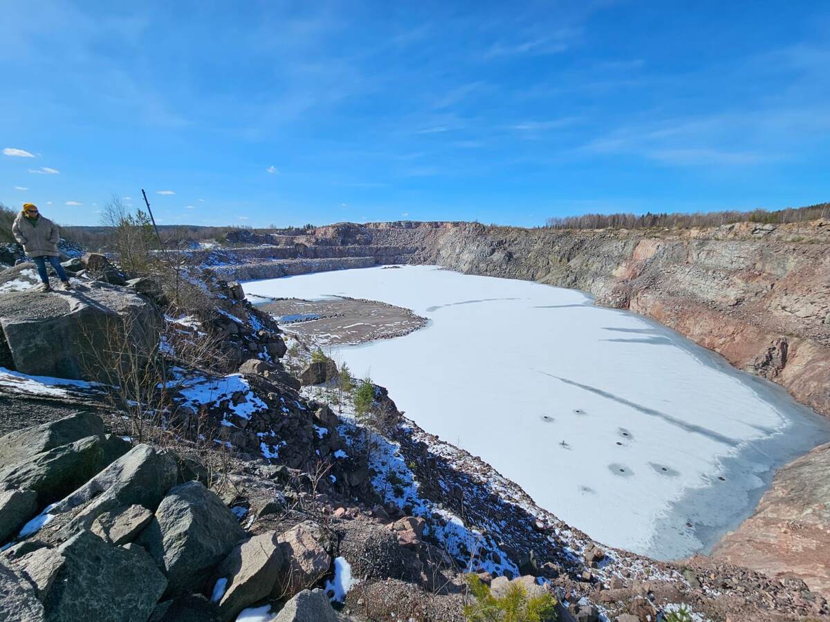 В один из прекрасных апрельских дней мы с мужем путешествовали по Ленинградской области. В Санкт-Петербург и область вернулась весна, хоть ещё день назад шёл снег и ночью температура опускалась до -4 градусов Цельсия. В воскресенье, 13 апреля 2025 года, было тепло и солнечно. Утром мы выдвинулись из Выборга в сторону Каменногорска, посетив по пути недостроенные пороховые погреба Русской крепости Выборг и Пальцевские скалы. Следующим объектом для посещения был затопленный гранитный карьер, расположенный в нескольких километрах от Каменногорска (ближайший к карьеру населенный пункт - деревня Пруды). Примерные координаты карьера - 60.996857, 29.026468. Проезд к объекту закрыт: дорогу перегораживают два шлагбаума. Но не верьте глазам своим: это бутафория. Никакого замка или фиксирующего механизма нет: створки просто отодвигаются. Стыдно быть нарушителями. Но мы ненадолго и с благими целями. Мусорить не будем и со скалы рыбкой в водоём прыгать не намерены. Тем более, что озеро на дне карьер