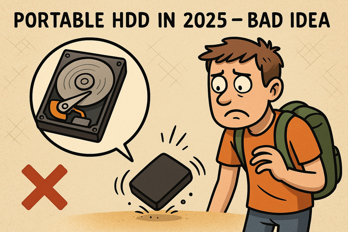 Жёсткие диски (HDD) до сих пор продаются и вроде как «удобны» — много памяти, недорого, можно с собой взять. Но в 2025 году, когда есть надёжные и быстрые SSD, брать переносной HDD — всё равно что возить фарфоровую чашку в рюкзаке без упаковки. В отличие от SSD, HDD — это механика. Внутри него: Теперь представьте: 👉 В этот момент происходит “head crash” — головка касается вращающейся пластины.